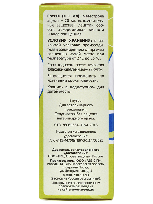 Применение препарата приводит к снижению уровней тестостерона в организме кобелей и эстрогена в организме сук, как следствие, угнетению половой охоты. При отмене препарата концентрация мегестрола ацетата в организме снижается, восстанавливается нормальный уровень ЛГ и ФСГ в крови животного, прекращается контрацептивное действие препарата и восстанавливается половой цикл.