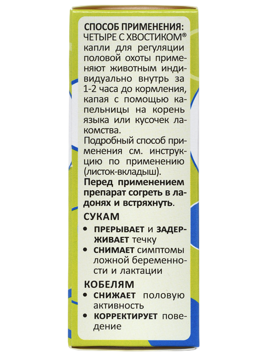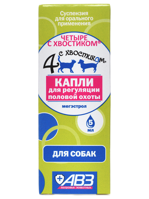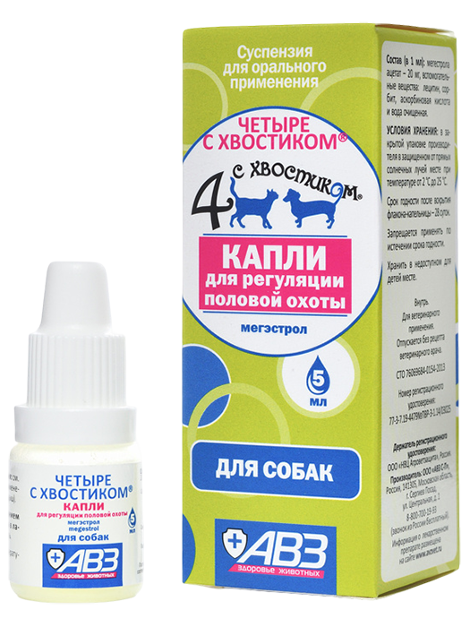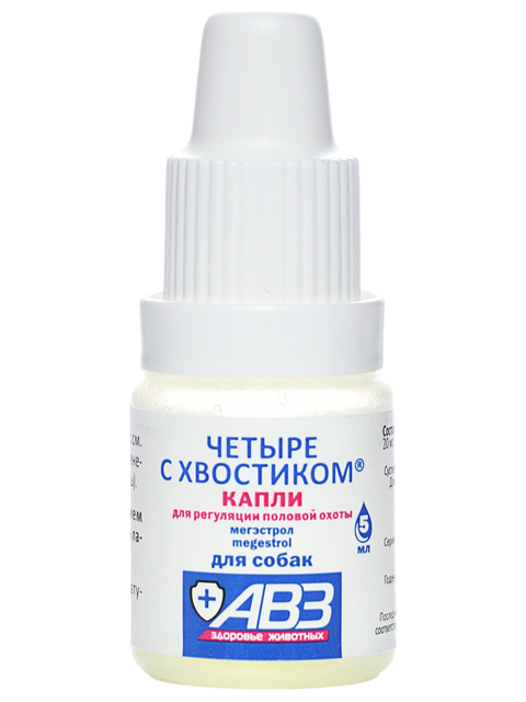 "Четыре с хвостиком" капли для регуляции половой охоты в 1 мл содержит в качестве действующего вещества мегестрола ацетат - 20 мг.