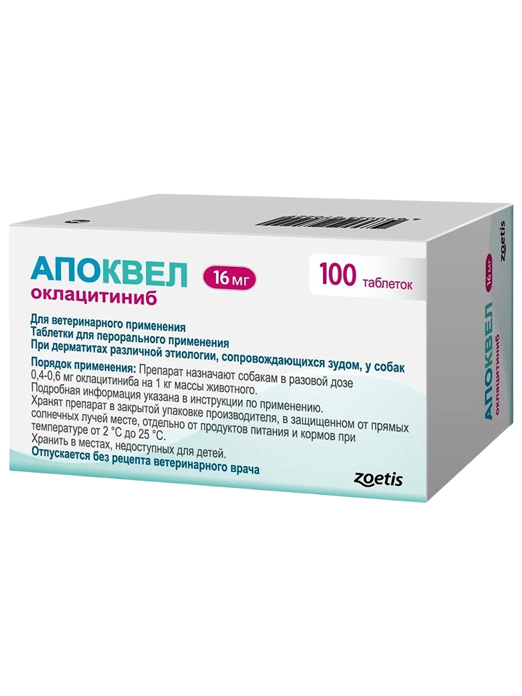 Препарат разработан для собак весом от 3 кг и возрастом от 12 месяцев. Применяется при аллергии любой этиологии для контроля симптомов зуда и воспаления. Максимальная концентрация оклацитиниба в крови менее, чем через 1 час. Действие препарата по снижению зуда начинается в среднем через 4 часа после дачи таблетки*.