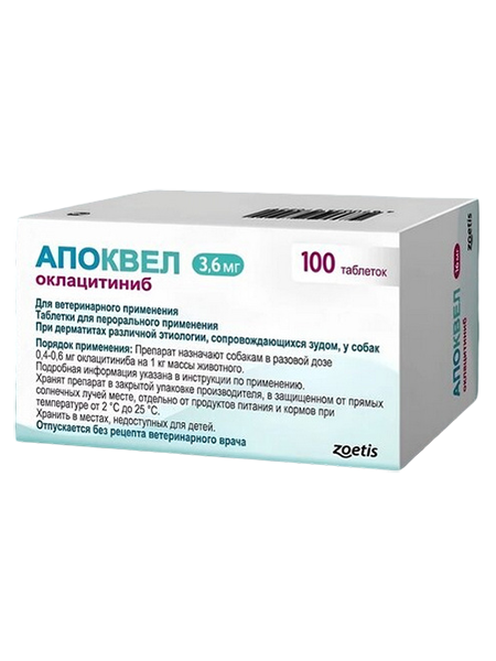 Препарат разработан для собак весом от 3 кг и возрастом от 12 месяцев. Применяется при аллергии любой этиологии для контроля симптомов зуда и воспаления. Максимальная концентрация оклацитиниба в крови менее, чем через 1 час. Действие препарата по снижению зуда начинается в среднем через 4 часа после дачи таблетки*.