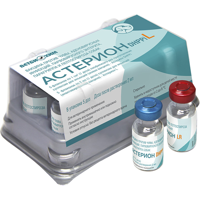 Вакцина Астерион DHPPiL предназначена для профилактики чумы, аденовирусных инфекций, парвовирусного энтерита, парагриппа и лептоспироза собак.