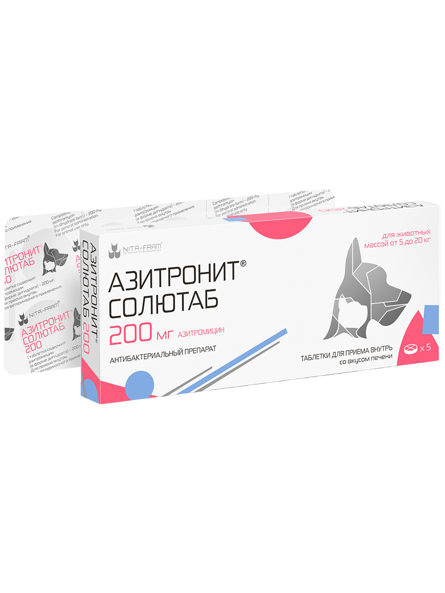 Азитронит® Солютаб применяют кошкам и собакам для лечения бактериальных инфекций органов дыхания, мочеполовой системы, инфекций кожи и мягких тканей, а также инфекций, вызываемых микроорганизмами, чувствительными к азитромицину.