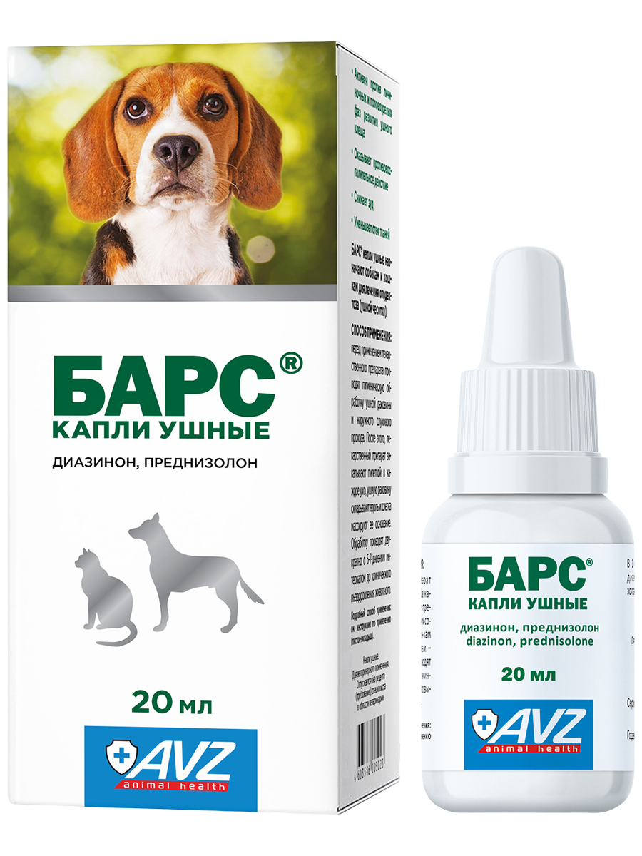 «Капли ушные БАРС®» в 1 мл в качестве действующих веществ содержат диазинон – 0,5 мг и преднизолон – 0,3 мг.
