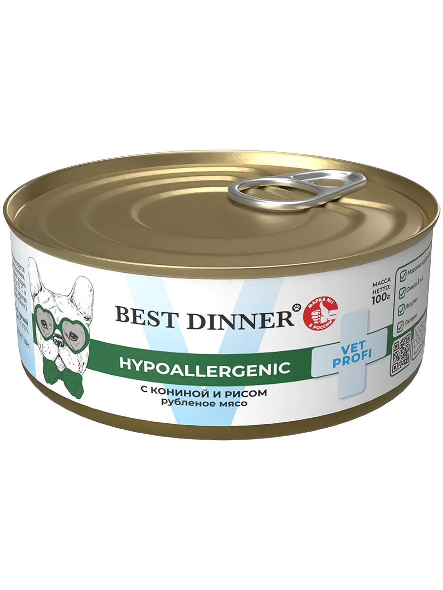 Рубленое мясо для собак с пищевой аллергией. Конина очень питательна, именно поэтому ее всегда употребляли кочевые народы. Большое количество аминокислот активизируют все обменные процессы в организме, улучшают пищеварение и состояние микрофлоры кишечника. Рис богат сложными углеводами. Инулин – природный пребиотик, стимулирующий выработку полезных микроорганизмов. Юкка Шидигера выводит токсины из организма. Рыбий жир является источником энергии и Омега-3 жирных кислот.