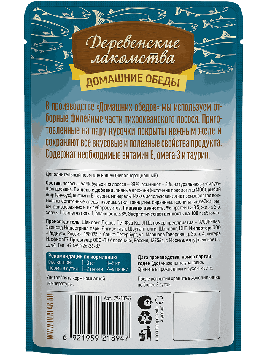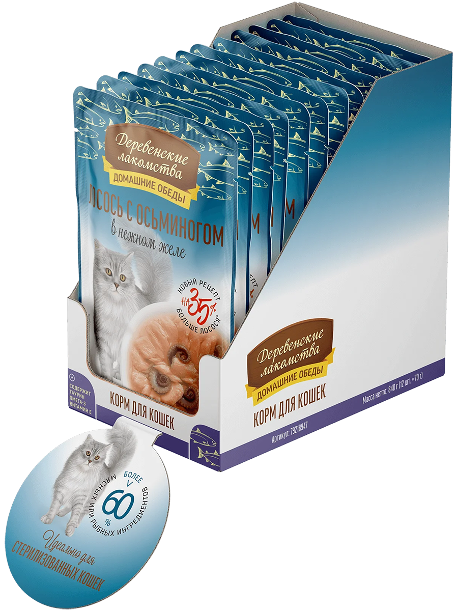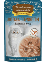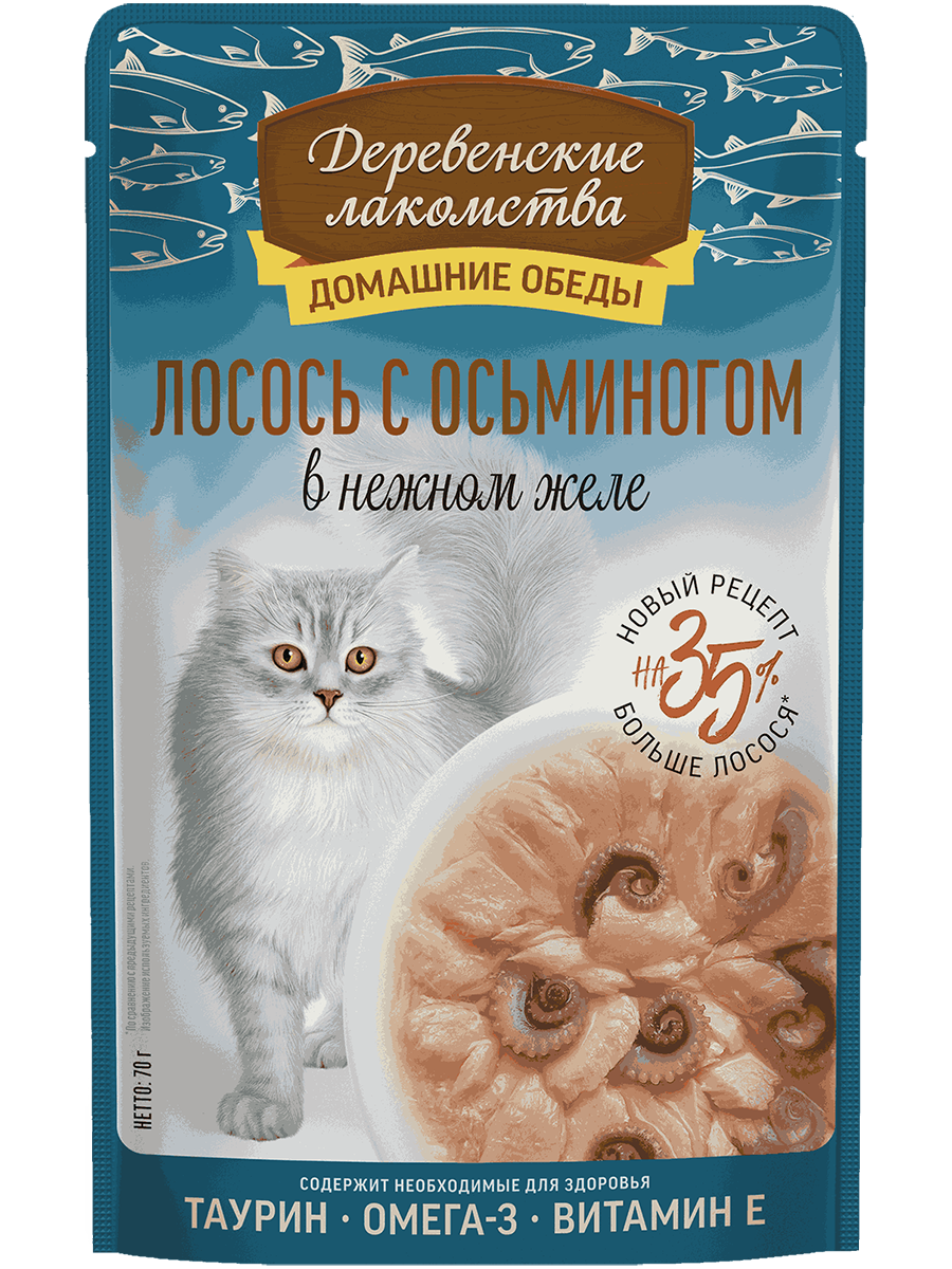Консервированный влажный корм для кошек серии "Деревенские лакомства - Домашние обеды" с лососем и экзотическим осьминогом — это не просто лакомство, а настоящий кулинарный шедевр, созданный с любовью и заботой о ваших пушистых гурманах. Рецепт с богатыми омега-3 жирными кислотами, белком и минералами разработан специально для здоровья кожи и шерсти вашего питомца, а также для поддержания его иммунитета и общей физической формы. Легкая текстура желе облегчает процесс потребления лакомства, делая этот продукт идеальным даже для самых привередливых питомцев.