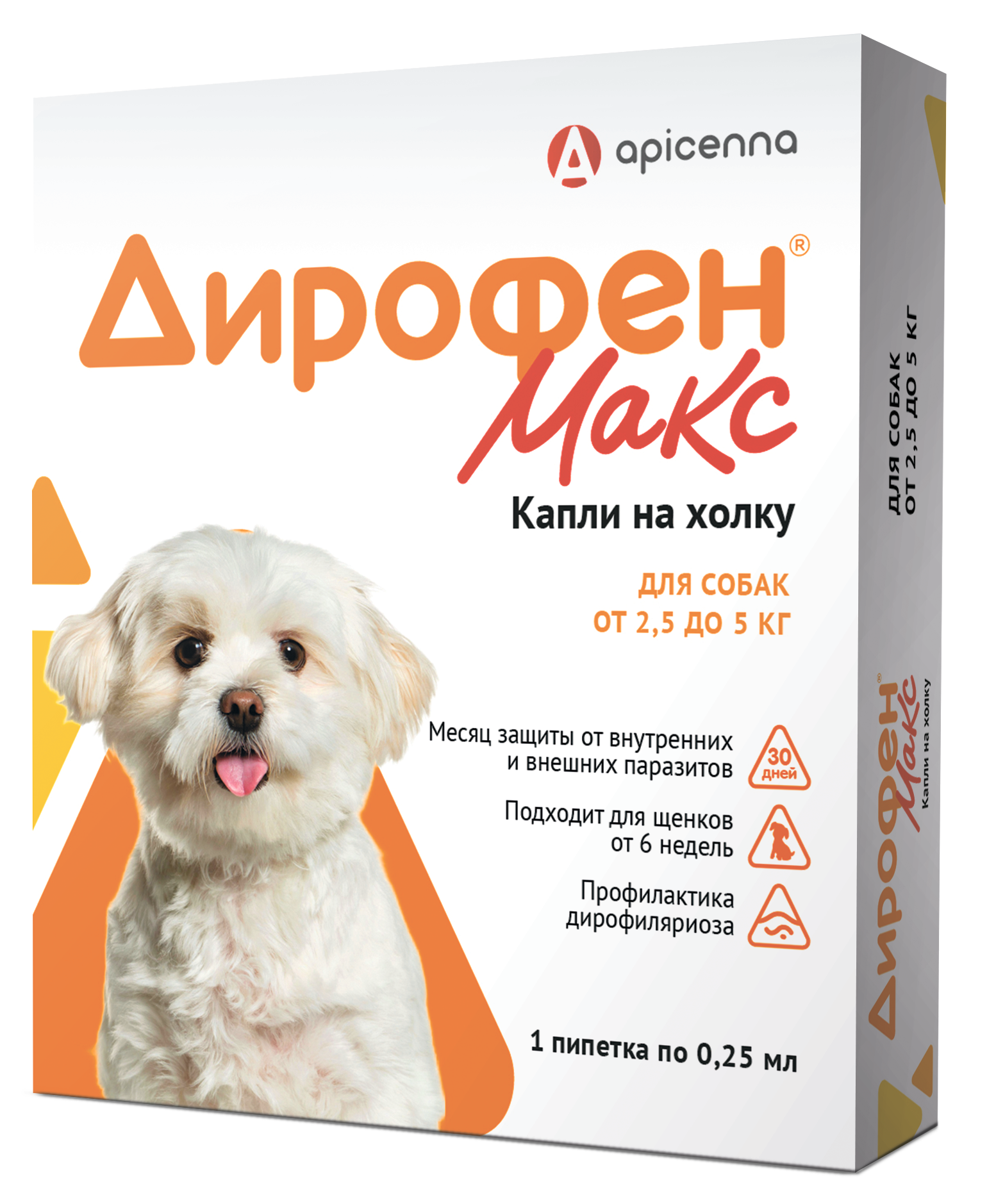 Дирофен Макс применяют собакам и кошкам путем однократного нанесения на сухую неповрежденную кожу в места, недоступные для слизывания (область спины между лопатками или область шеи у основания черепа), используя пипетки различной фасовки.