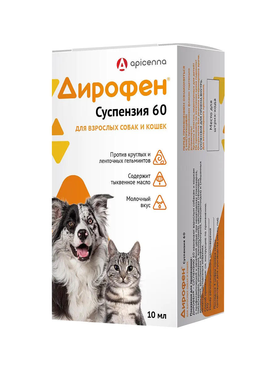 взрослым собакам и кошкам — 1 мл Дирофен-суспензии 60 на 3 кг массы животного;