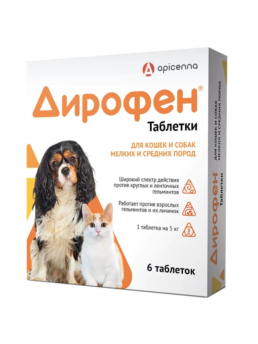 - Дирофен таблетки для кошек и собак мелких и средних пород — 1 таблетка на 5 кг массы животного
