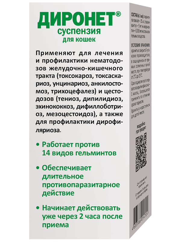 «Диронет» суспензия в 1 мл в качестве действующих веществ содержит: пирантела памоат – 15 мг, празиквантел – 5 мг и ивермектин – 0,006 мг и вспомогательные вещества.
