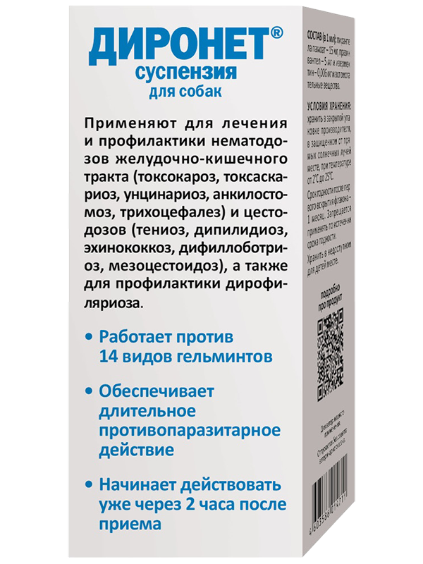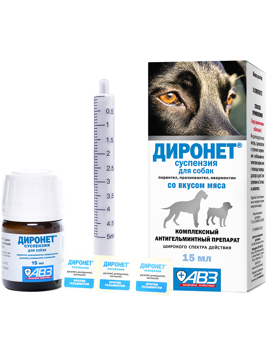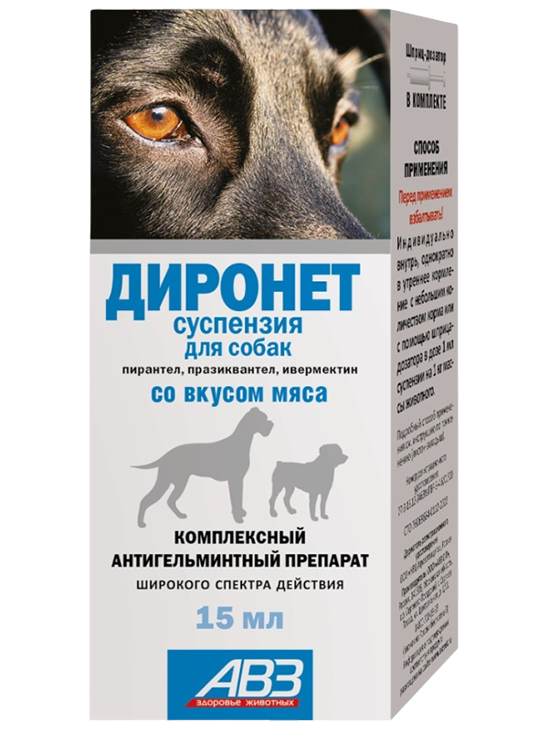 «Диронет» суспензия – полимерный флакон 15 мл со шприцем-дозатором в картонной коробке.