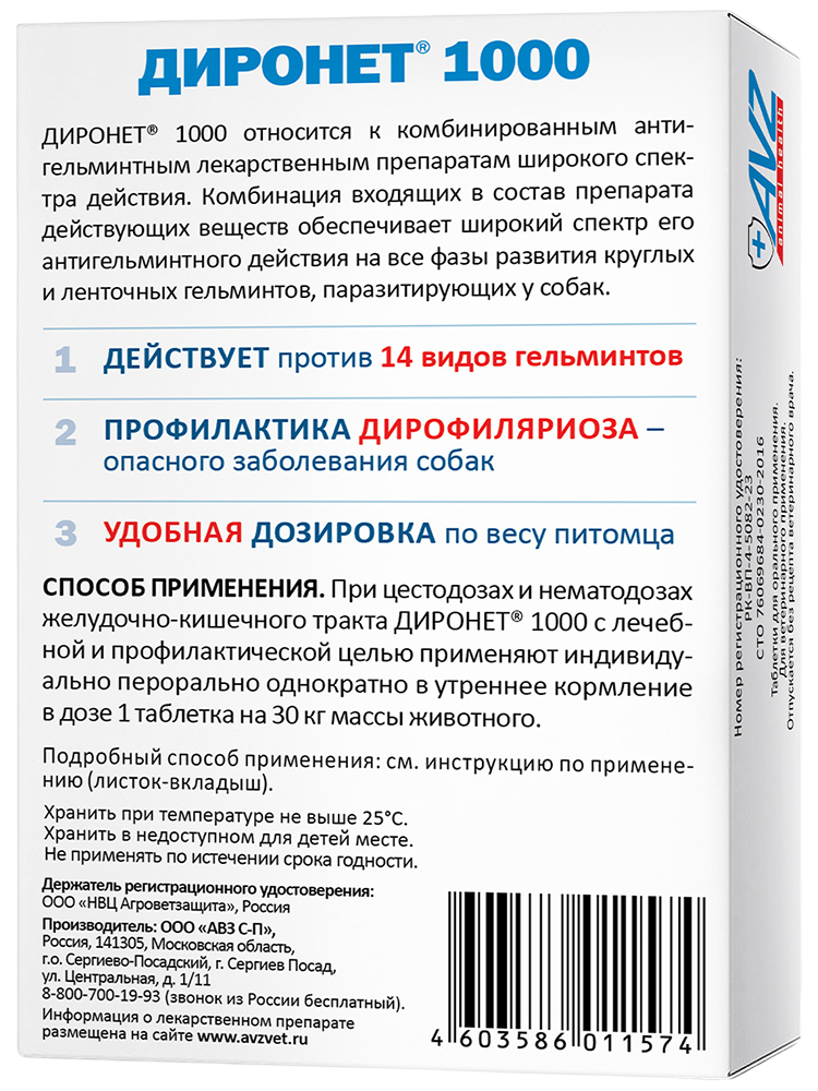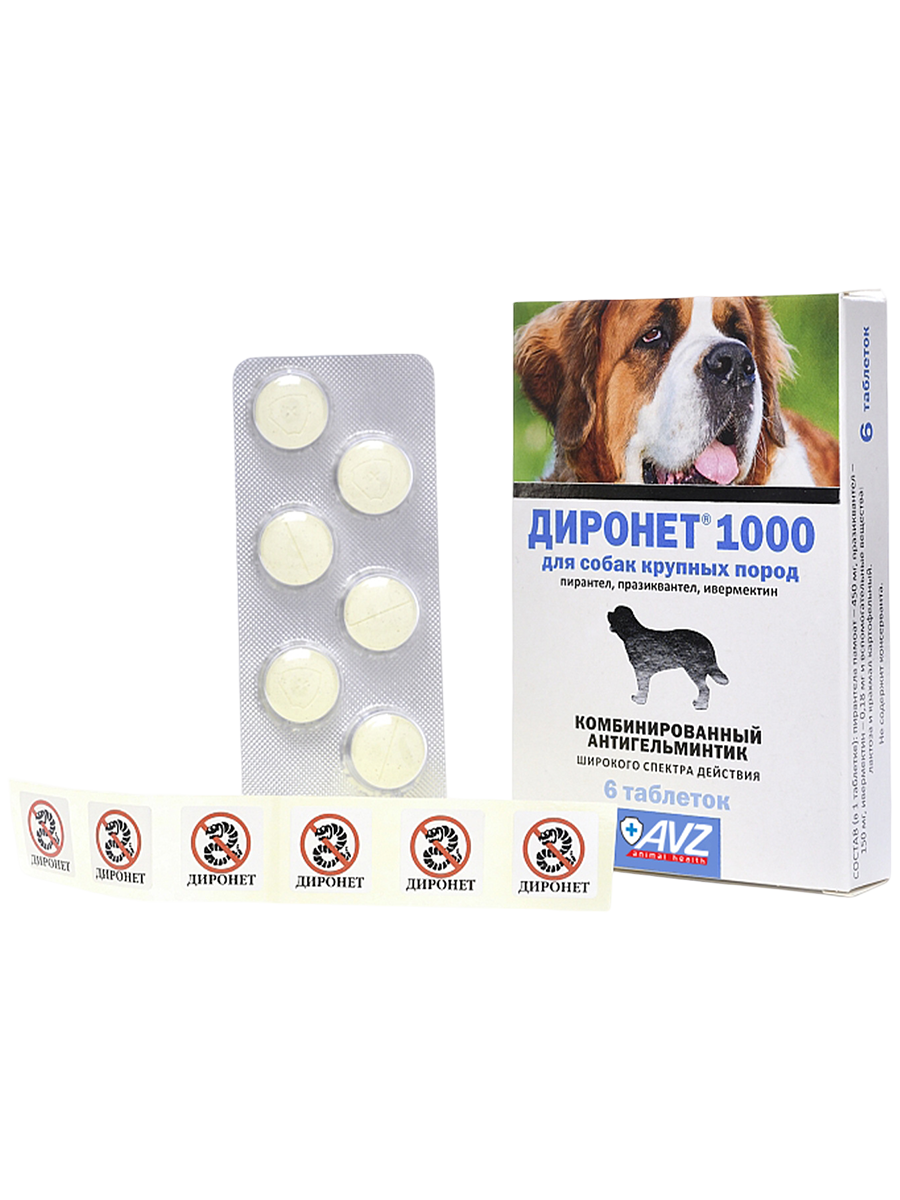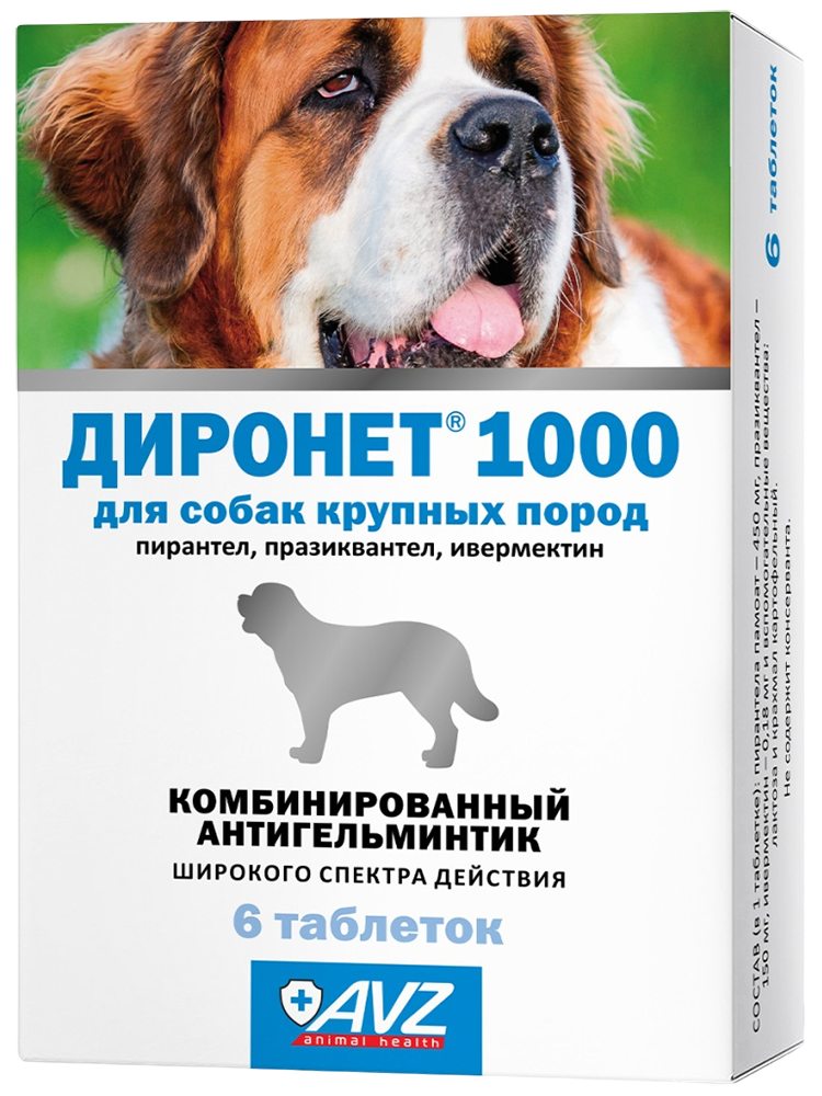 Диронет 1000 предназначен для собак крупных пород, содержит в одной таблетке пирантела памоат 450 мг, празиквантела 150 мг и ивермектина 0,18 мг. Доза - 1 таблетка на 30 кг массы тела животного.