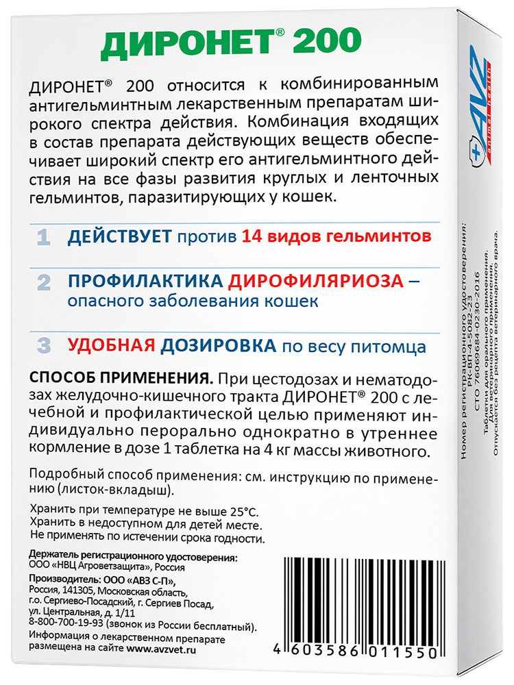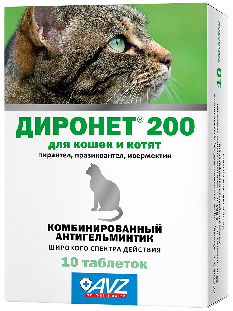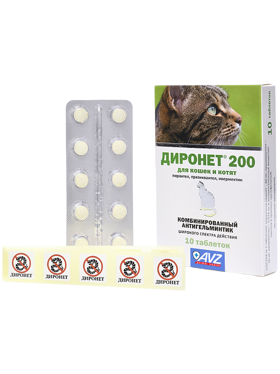 Диронет 200 предназначен для кошек и котят, содержит в одной таблетке пирантела памоата 60 мг, празиквантела 20 мг и ивермектина 0,024 мг. Доза - 1 таблетка на 4 кг массы тела животного. В упаковке 10 таблеток.