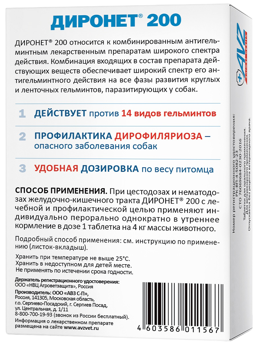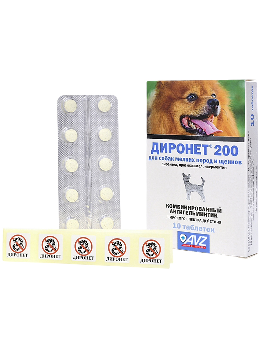 Диронет 200 для собак мелких пород и щенков, содержит в одной двояковыпуклой таблетке пирантела памоат 60 мг, празиквантела 20 мг и ивермектина 0, 024 мг. Доза - 1 таблетка на 4 кг массы тела животного.