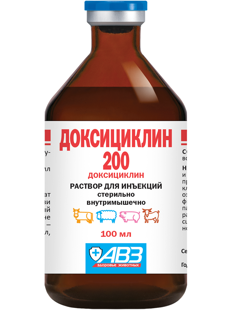 11. Доксициклин 200 назначают крупному и мелкому рогатому скоту, свиньям с лечебной целью при инфекциях, вызванных чувствительными к доксициклину микроорганизмами, в том числе при колибактериозе, сальмонеллезе, стафилококкозе, пневмонии, гемофилёзе, энзоотической пневмонии свиней, роже свиней, пастереллезе, копытной гнили, кератоконъюнктивите, раневых инфекциях, артритах, пупочном сепсисе, абсцессах, хламидиозе и других заболеваниях бактериальной и микоплазменной этиологии.
