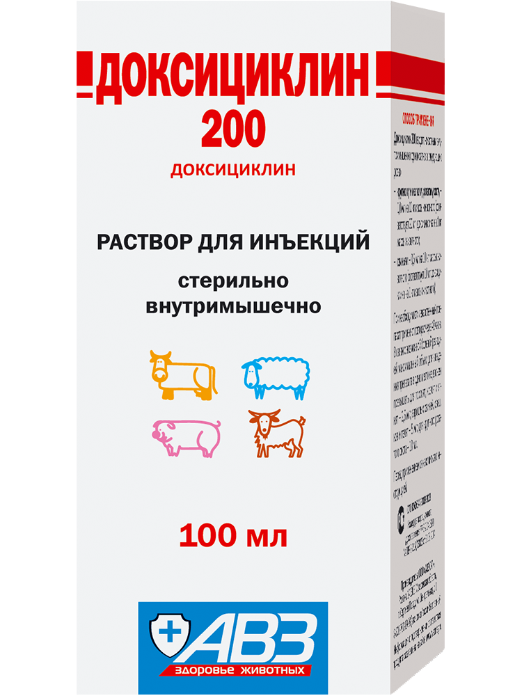 крупному и мелкому рогатому скоту — 1,0 мл на 10 кг массы животного (соответствует 20 мг доксициклина на 1 кг массы животного);
