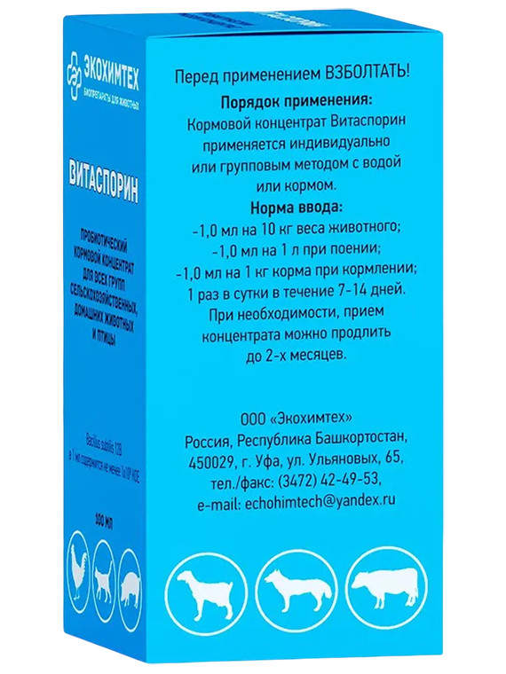 Устойчивость Витаспорина ко многим антибиотикам: (мономицину, гентамицину, полимиксину, левомецину, стрептомицину и др.) позволяет применять кормовую добавку в период лечения животных и минимизировать отрицательные последствия антибиотикотерапии.