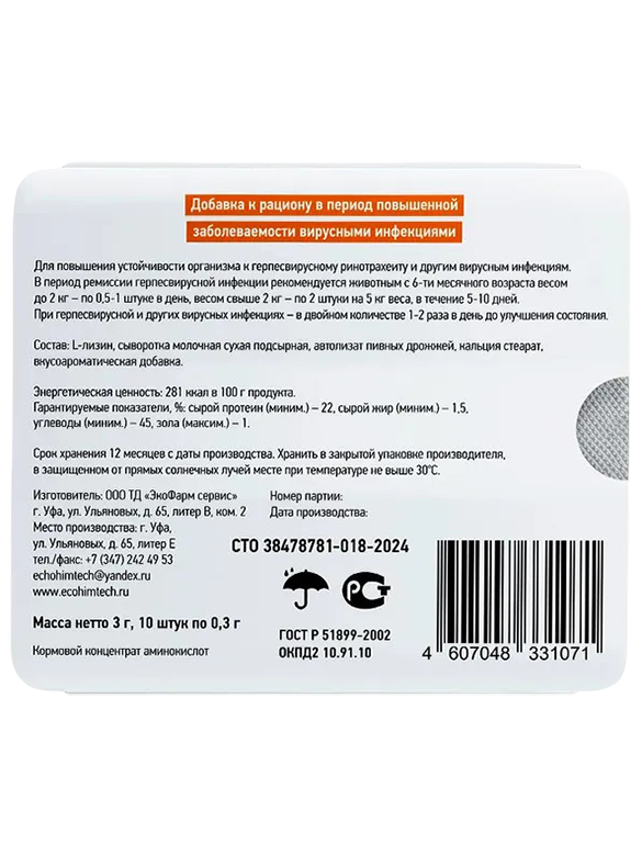 Добавка содержит природную аминокислоту — L-лизин в количестве 250 мг в 1 шт и вкусные полезные наполнители. Добавка к рациону полезна для профилактики и может быть использована в случае герпесвирусного ринотрахеита у кошек и герпесвирусной инфекции собак. Препарат, содержащий лизин, полезен при недостаточности его в рационе или в период повышенной потребности организма кошки или собаки в лизине (травмы, восстановление после операций, при отставании в росте, нарушениях обмена кальция и др.).