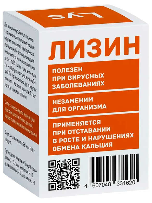 Кормовой концентрат аминокислот Лизин — аминокислота, входящая в состав практически всех белков. L-лизин способен подавлять вирусы, особенно, вызывающие герпес и другие острые респираторные инфекции кошек и собак.