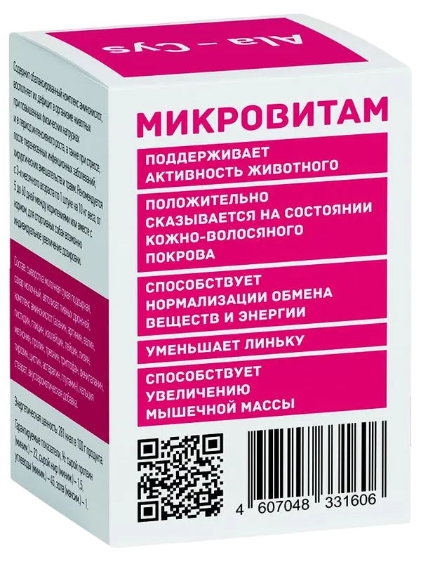Добавка Микровитам в таблетках способствует выведению токсинов и активизирует обменные процессы, поэтому может быть рекомендована животным, испытывающим значительные физические нагрузки, стресс, а также для восстановления после любых болезней и интоксикаций.