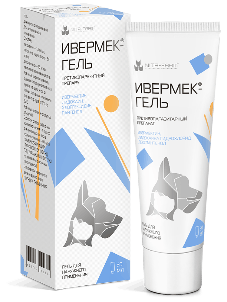 Противопаразитарное средство, содержащее в качестве действующего вещества ивермектин, получаемый путем ферментации гриба Streptomyces avermitilis. 1 мл препарата содержит 1 мг ивермектина, 15 мг пантенола, 50 мг лидокаина, а также гелеобразующую основу. По внешнему виду представляет собой прозрачный опалесцирующий гидрофильный гель от бесцветного до светло-желтого цвета. Расфасовывают в пластиковые тубы по 30 мл.