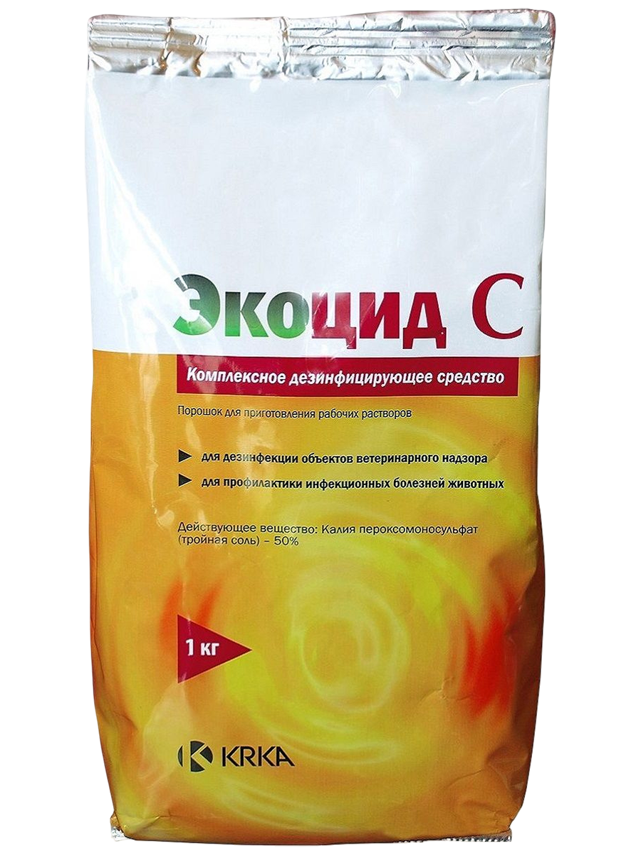 Действующий компонент препарата — сильный окислитель, который инактивирует и разрушает бактерии, грибы и вирусы, включая особо опасный вирус африканской чумы свиней. Органические кислоты в сочетании с буферной системой обеспечивают необходимое подкисление среды, которое оптимизирует дезинфицирующую активность окислителя. Экоцид С не теряет своей активности в жесткой воде, в присутствии органических загрязнений и при низких температурах окружающей среды. Приготовленные рабочие растворы препарата не разрушают материал обрабатываемой поверхности и не обладают коррозийными свойствами. Экоцид С по степени воздействия на организм теплокровных животных относится к умеренно опасным веществам и в рекомендуемых концентрациях не обладает сенсибилизирующим и местнораздражающим действием на кожу. При попадании на слизистые оболочки вызывает слабое раздражение.