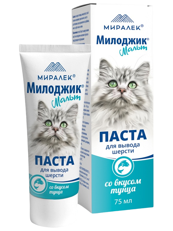 Милоджик Мальт представляет собой добавку в форме пасты и обладает привлекательным для кошек вкусом тунца, его можно давать как лакомство, предназначен для выведения комков шерсти из ЖКТ и профилактики их образования.