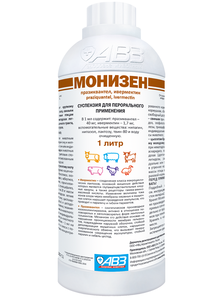 Монизен в качестве действующих веществ в 1 мл содержит празиквантел - 40 мг и ивермектин - 1,7 мг и вспом. вещества