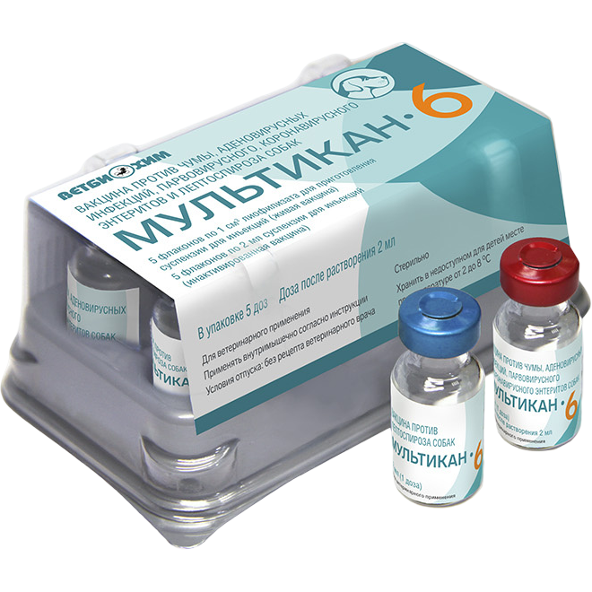 МУЛЬТИКАН-6 против чумы, аденовирусных инфекций, парвовирусного и коронавирусного энтеритов и лептоспироза собак