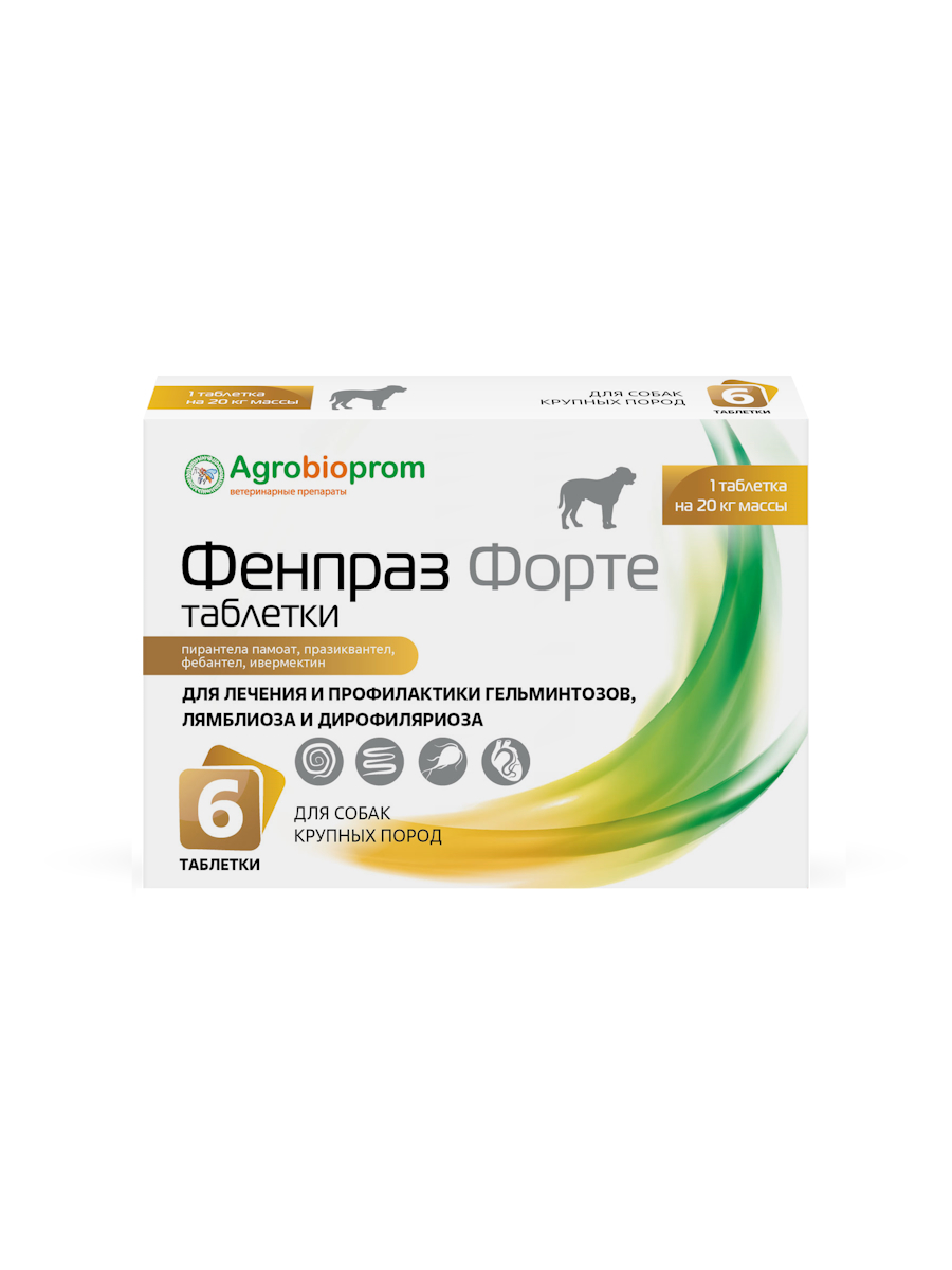 Фенпраз Форте таблетки для собак крупных пород с содержанием в 1 таблетке, рассчитанной на 20 кг массы животного, действующих веществ: пирантела памоата - 288 мг, празиквантела - 100 мг, фебантела - 300 мг, ивермектина - 0,12 мг.