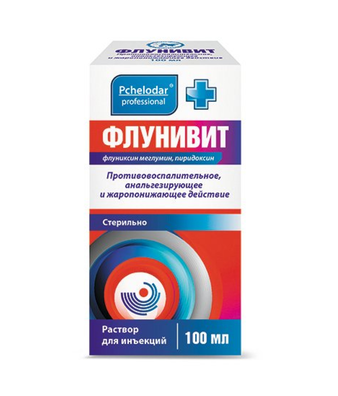 Флунивит (противовоспалительный, обезболивающий и жаропонижающий препарат) ДВ - флуниксина меглумин, пиридоксина гидрохлорид.