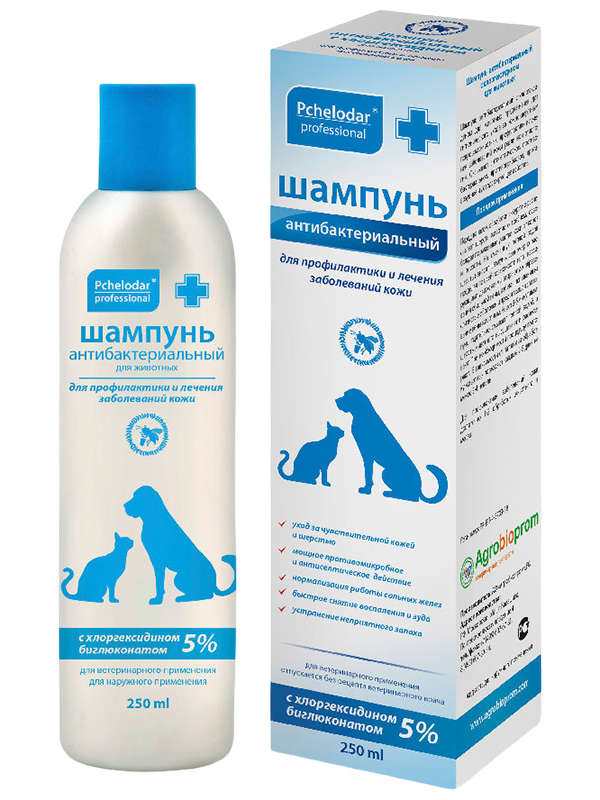Антибактериальный шампунь пролонгированного действия с хлоргексидином и экстрактом прополиса для животных. Входящий в состав шампуня хлоргексидина биглюконат, оказывает бактерицидное действие на все виды микробов, которые являются причиной различных кожных заболеваний.