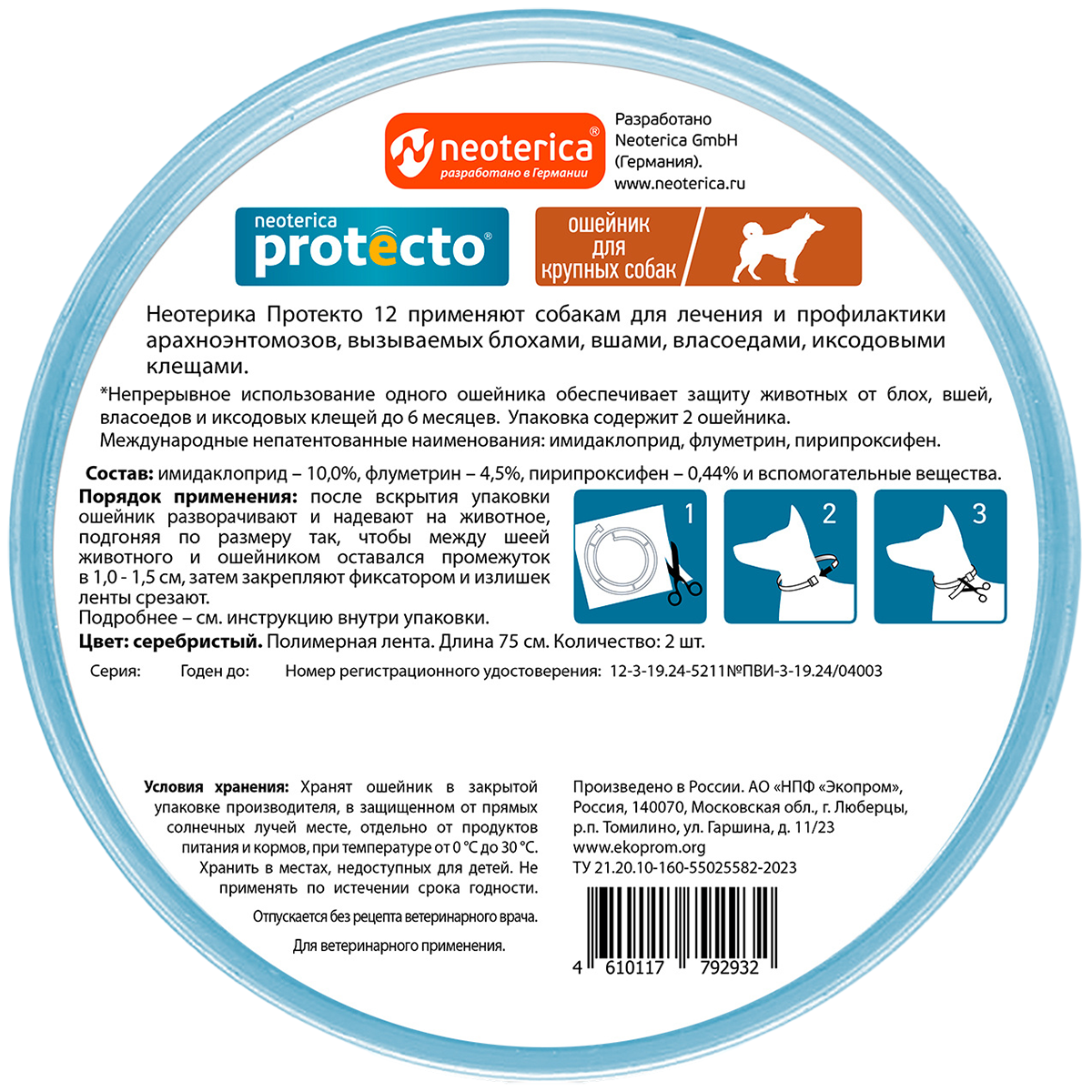 Ошейник Неотерика Протекто 12 применяют кошкам и собакам для лечения и профилактики арахноэнтомозов, вызываемых блохами, вшами, власоедами, иксодовыми клещами, защиты животных от нападения двукрылых кровососущих насекомых и профилактики трансмиссивных заболеваний (бабезиоз, боррелиоз, дирофиляриоз)