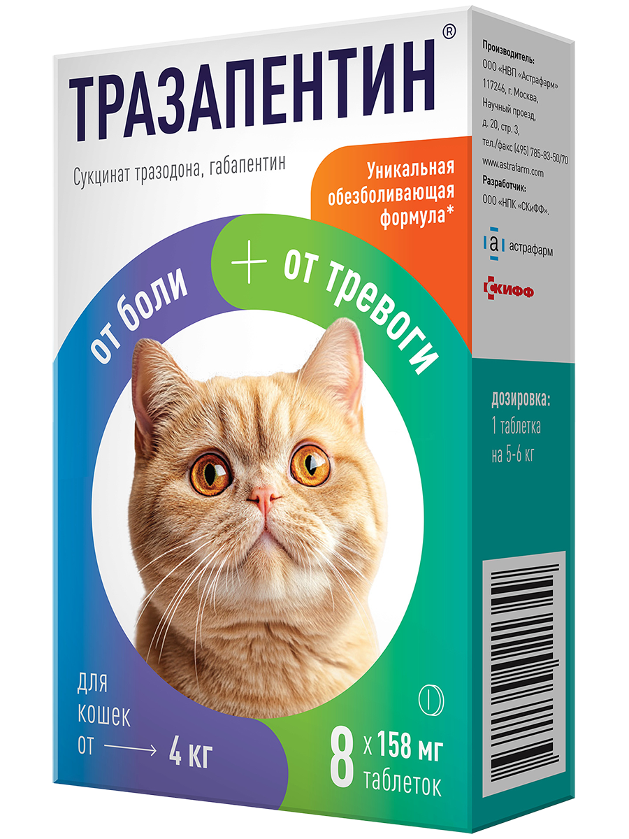 Тразапентин® таблетки для кошек от 4 кг (масса таблетки 158 мг) - 54 мг габапентина и 18 мг сукцината тразодона на таблетку