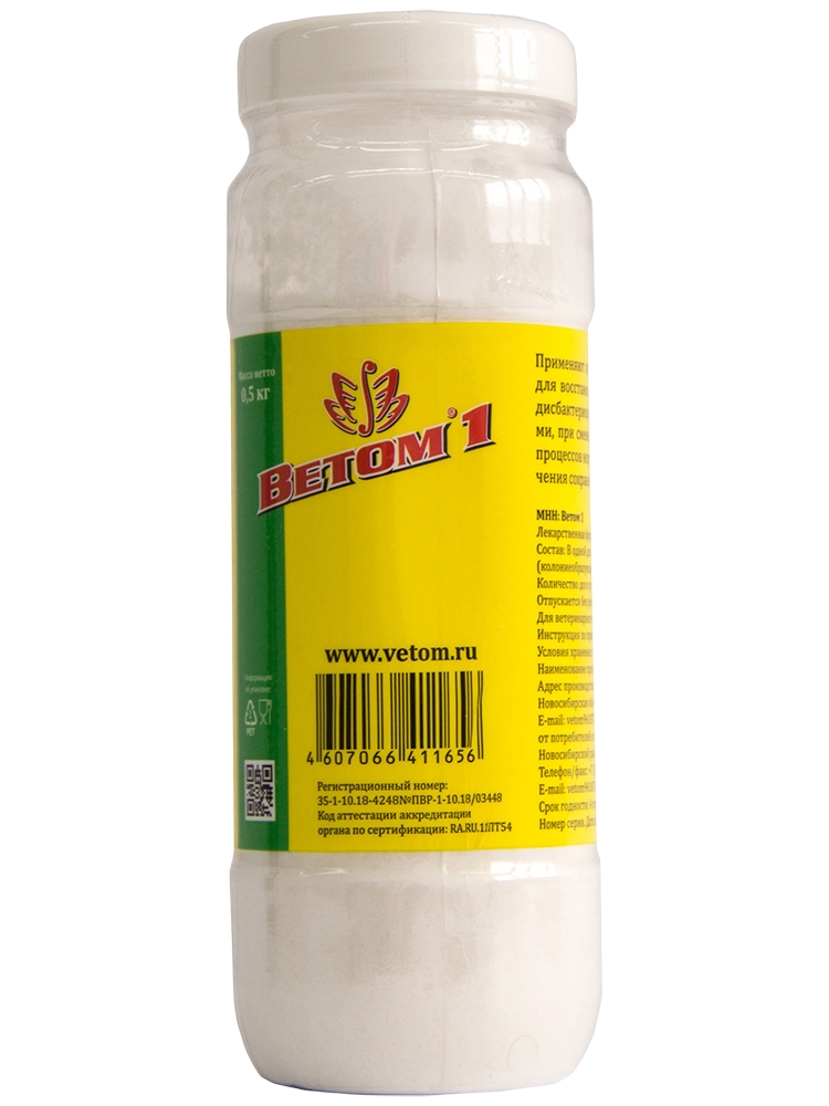 Порошок для приема внутрь и ректального применения. Ветом 1 содержит сухую бакмассу живых спорообразующих бактерии штамма Bacillus subtilis DSM 32424, а также вспомогательные вещества - сахарную пудру и крахмал. В 1 г препарата содержится: живых микробных клеток бактерий Bacillus subtilis - не менее 1x106 КОЕ (колониеобразующих единиц). По внешнему виду Ветом 1 представляет собой мелкодисперсный порошок белого цвета, без запаха, растворимый в воде, с образованием осадка белого цвета. Лекарственный препарат расфасован по 1,0 г (1 доза); 2,0 г (2 дозы); 5,0 г (5 доз); 10,0 г (10 доз); 50,0 г (50 доз); 100,0 г (100 доз); 300,0 г (300 доз) и 500,0 г (500 доз) в пакеты из ламинированной бумаги или полимерных водонепроницаемых материалов или в банки полимерные.