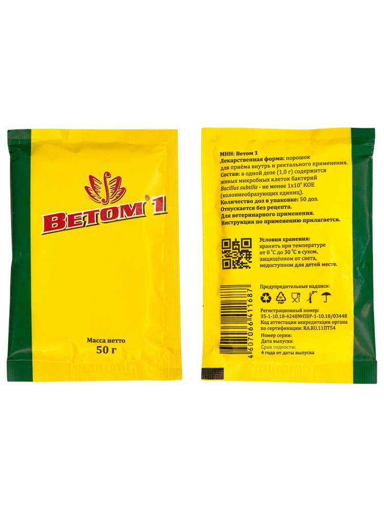 Порошок для приема внутрь и ректального применения. Ветом 1 содержит сухую бакмассу живых спорообразующих бактерии штамма Bacillus subtilis DSM 32424, а также вспомогательные вещества - сахарную пудру и крахмал. В 1 г препарата содержится: живых микробных клеток бактерий Bacillus subtilis - не менее 1x106 КОЕ (колониеобразующих единиц). По внешнему виду Ветом 1 представляет собой мелкодисперсный порошок белого цвета, без запаха, растворимый в воде, с образованием осадка белого цвета. Лекарственный препарат расфасован по 1,0 г (1 доза); 2,0 г (2 дозы); 5,0 г (5 доз); 10,0 г (10 доз); 50,0 г (50 доз); 100,0 г (100 доз); 300,0 г (300 доз) и 500,0 г (500 доз) в пакеты из ламинированной бумаги или полимерных водонепроницаемых материалов или в банки полимерные.