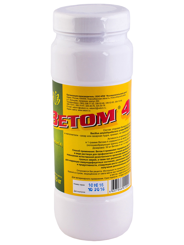Ветом 4 обладает высокой антагонистической активностью к широкому спектру патогенных и условно патогенных микроорганизмов за счет свойств Bacillus subtilis. Препарат предупреждает развитие дисбактериоза, повышает неспецифическую резистентность организма и нормализует обмен веществ.